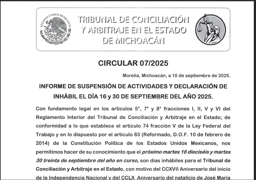 Nos permitimos hacer de su conocimiento que el próximo martes 16 dieciséis y martes 30 treinta de septiembre del año en curso, son días inhábiles para el Tribunal de Conciliación y Arbitraje en el Estado, con motivo del CCXVII Aniversario del inicio de la Independencia Nacional y del CCLX Aniversario del natalicio de José María Morelos y Pavón; declarándose en consecuencia y para los efectos legales como días inhábiles.
